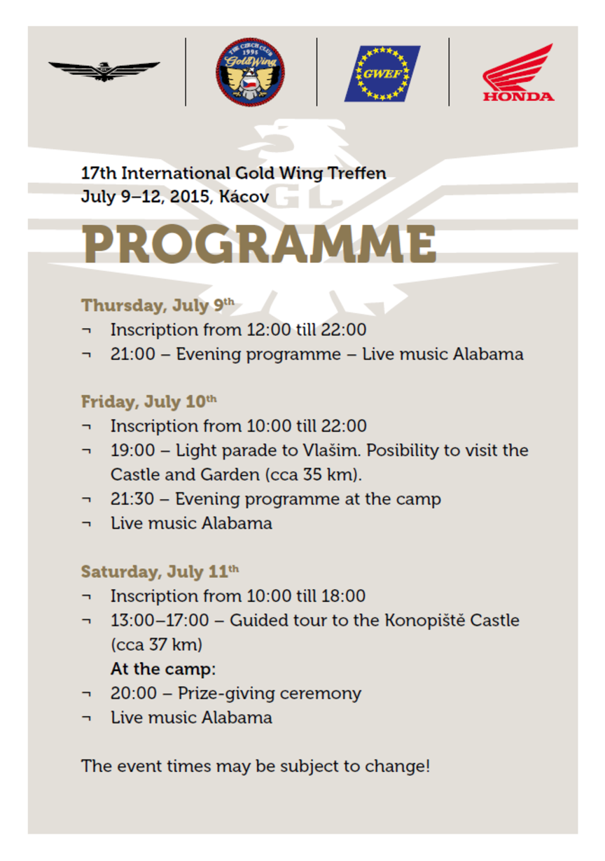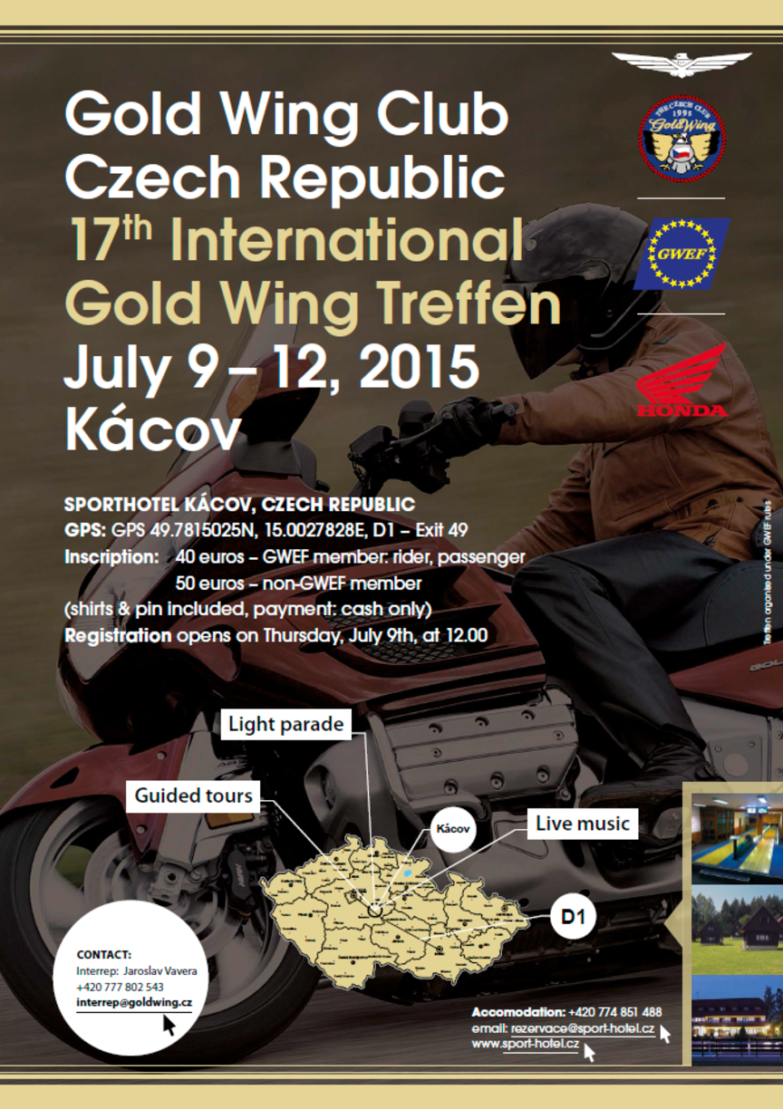 Novinky a akcie Pozvánka na 17. medzinárodný Gold Wing zraz 9.—12. 7. 2015, Kácov, ČR Štvrtok, 2015, júla 2