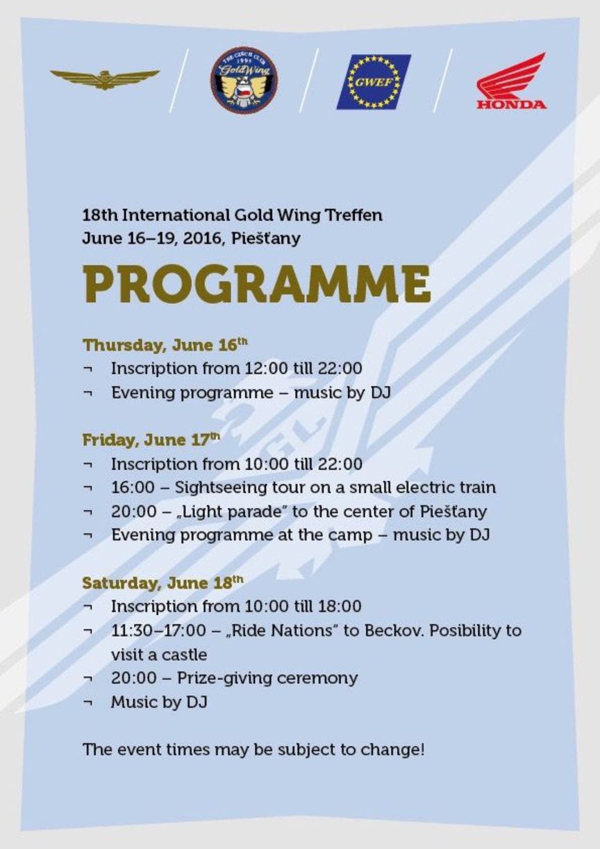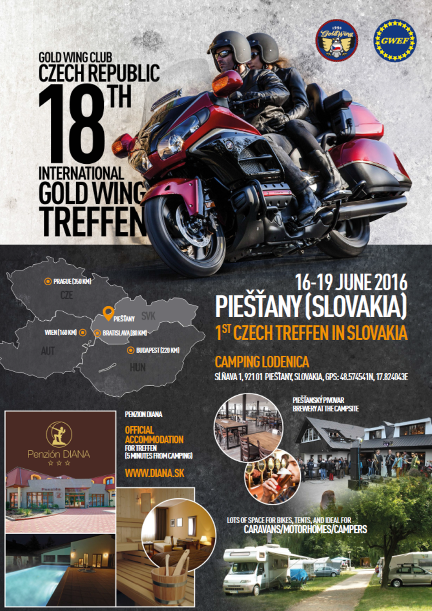 Do kúpeľného mesta zavítajú majitelia Zlatých krídiel takmer z celej Európy. Dôvodom nie je liečba niektorých neduhov spôsobených jazdou na motocykloch, ale osemnásty medzinárodný zraz strojov značky Honda, ktorý organizuje český Gold Wing klub (GWCCZ). Čaká tu na vás zaujímavý program s organizovanými jazdami. Hlavne piatočná „light parade“ stojí za návštevu. Vo večerných hodinách má spoločná jazda viac než stovky Gold Wingov svoje jedinečné kúzlo. Zrazu sa samozrejme môžu zúčastniť aj majitelia motocyklov iných značiek.