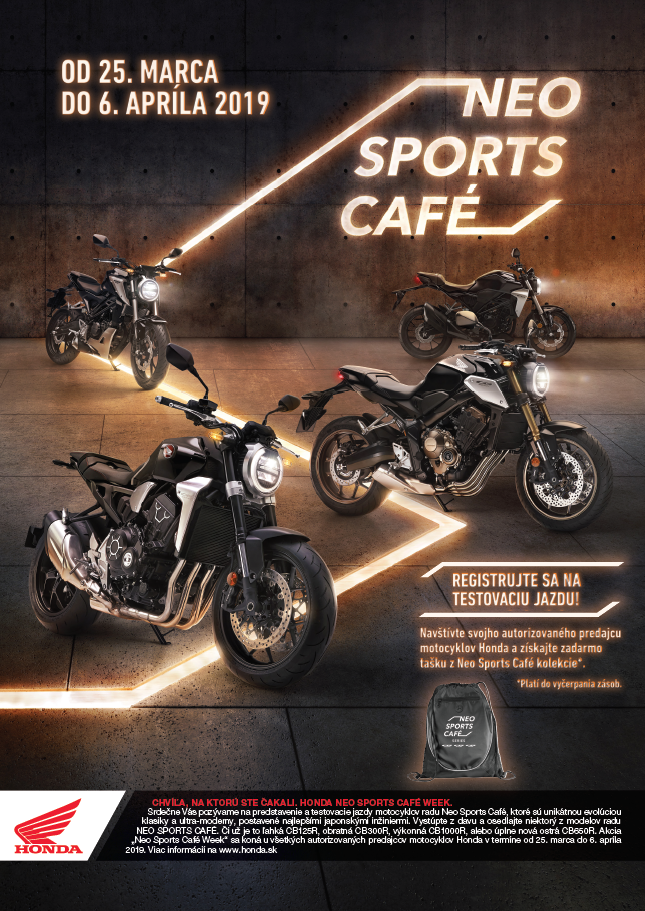 Akcia "Neo Sports Café Week" sa koná u autorizovaných predajcov motocyklov Honda v termíne 25. marca - 6. apríla 2019.
