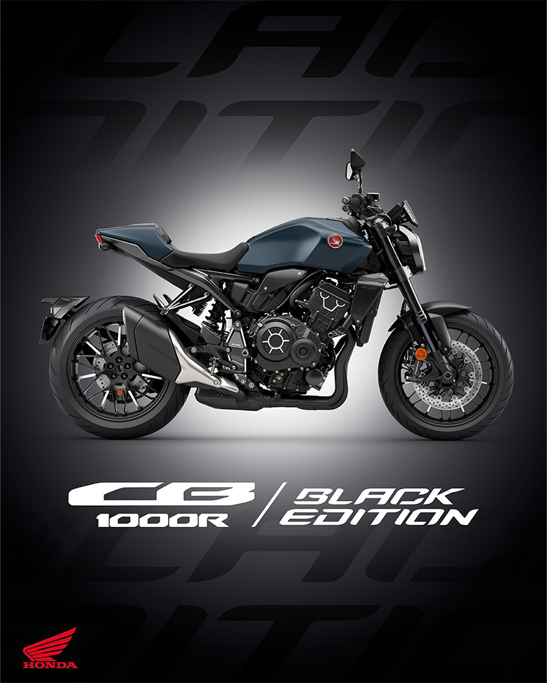 Nový model CB1000R „Black Edition“ v matnej modrej metalíze Mat Jeans Blue Metallic rozširuje ponuku verzie Black Edition na špičke rodiny strojov Neo Sports Café značky Honda. Obe farebné vyhotovenia sa vyznačujú novým strieborným akcentom na nádrži, ktorý ladí so starostlivo vybranými obrábanými hliníkovými detailmi na lúčoch kolies, doskách kyvného ramena, krytoch motora a objímkach riadidiel. Elegantný a agresívny celkový vzhľad je korunovaný farebne zladeným krytom sedadla spolujazdca. Aj štandardné vyhotovenie CB1000R získava pre modelový rok 2023 nový vzhľad – dostupné bude v elegantnom červenom metalickom vyhotovení Bordeaux Red Metallic.