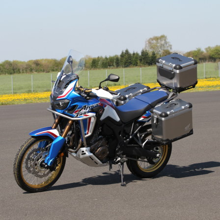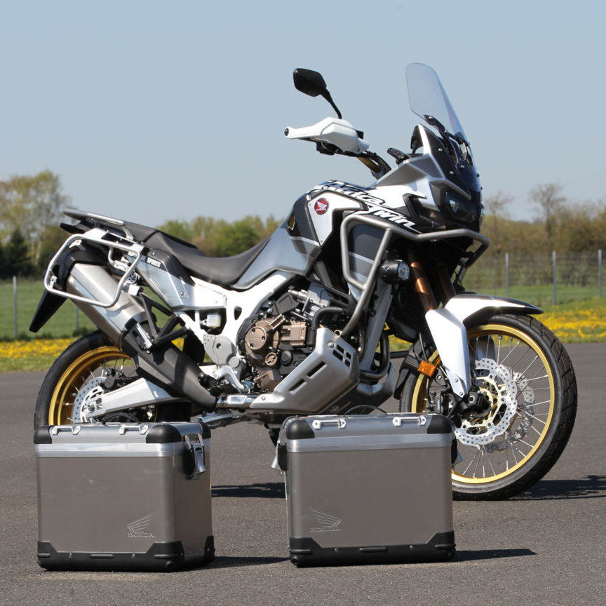Dovoľte, aby sme vám oznámili zahájenie predaja sád hliníkových kufrov pre model Africa Twin a Africa Twin Adventure Sports. Tieto kufre sú pripravené v spolupráci so spoločnosťou Touratech a sú osadené nastaviteľnými zámkami, možno ich teda uzamykať jedným originálnym kľúčom k motocyklu.